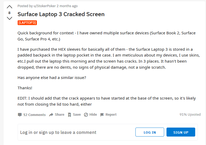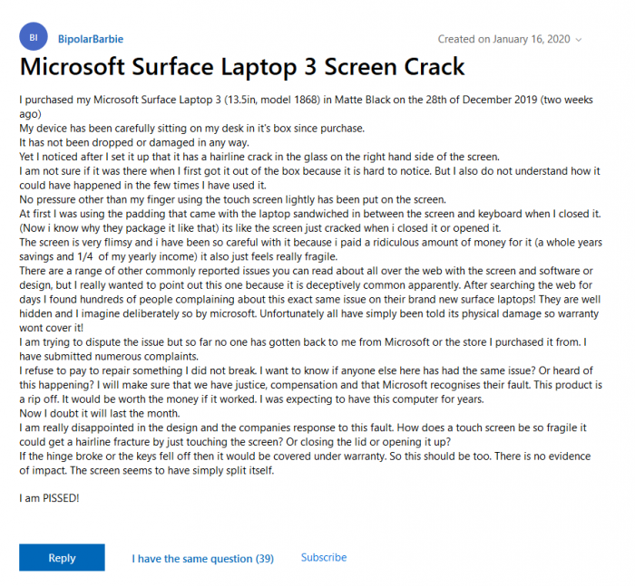 拉斐尔·里维拉(Rafael Rivera)在Twitter上进一步曝光了这件事情,从而引发更多媒体和消费者的关注。在他发布的推文中引用了来自Reddit社区的多条用户反馈链接,都在吐槽Surface Laptop 3屏幕破裂的问题。