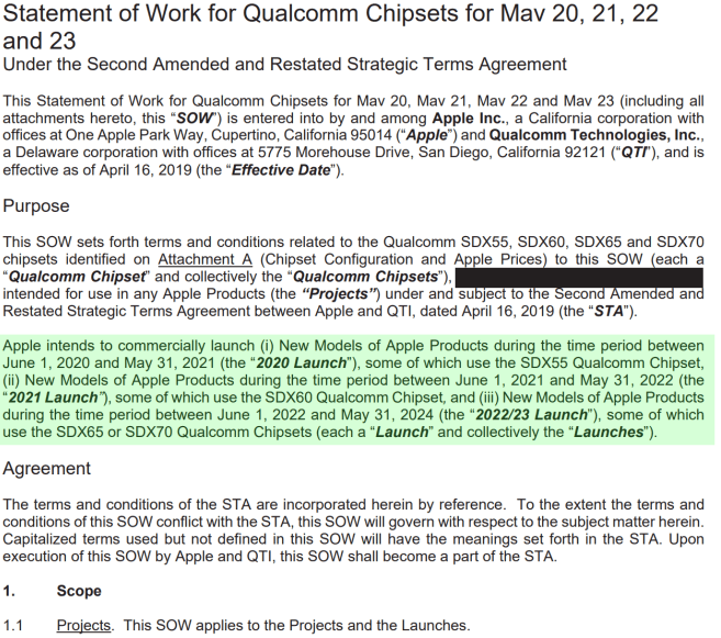 简单来说,苹果至少要在未来4年购买高通的5G基带。其中,2020年6月1日到2021年5月31日使用X55基带,2021年6月1日到2022年5月31日使用X60,2022年6月1日到2024年5月31日使用X65或者X70。