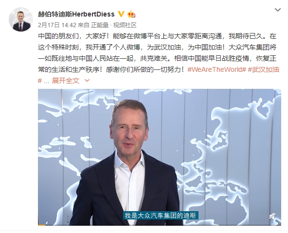 2月17日,大众汽车集团CEO赫伯特·迪斯(Herbert Diess)开通个人微博,其希望通过此举与中国消费者零距离沟通,并借此为武汉加油。迪斯在其首条微博中写道:“能够在微博平台上与大家零距离沟通,我期待已久,在这个特殊时刻,我开通了个人微博,为武汉加油,为中国加油!