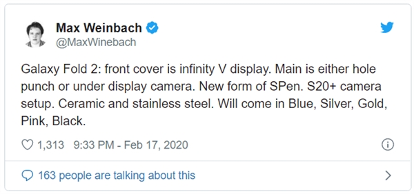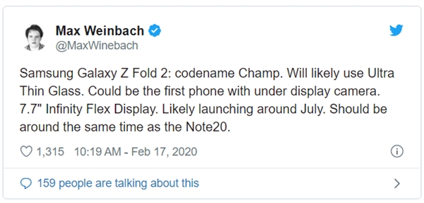 近日,国外媒体编辑Max Weinbach在推特爆料,代号为Champ的Galaxy Fold 2将搭载诸多新设计,譬如与Galaxy Z Flip相同的超薄玻璃、屏下摄像头技术以及7.7英寸的Infinity Flex显示屏,并将于Galaxy Note 20一起在7月左右推出。