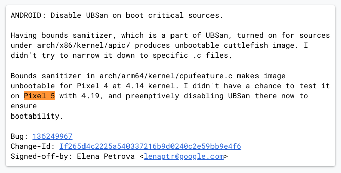 有关 Linux 内核代码的修订评论,提到了“Pixel 5 with (version) 4.19”。结合先前发现的运行 Linux Kernel 4.19、且名为“bramble”的设备报告,可认定其中一款即将到来的 Pixel 新机。