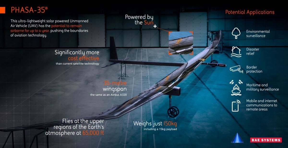 跟卫星相比,PHASA-35的建造和运行成本更低,并且它还是一个持久、稳定的空中平台、具有军事和民用应用包括监视、通信、安全、遥感、环境科学、森林火灾探测和海上监视等。