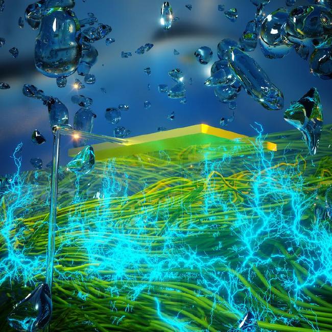 在“空气发电机”中,电极与蛋白质纳米线相连,空气中自然存在的水分就可以生成电流。