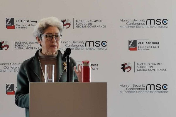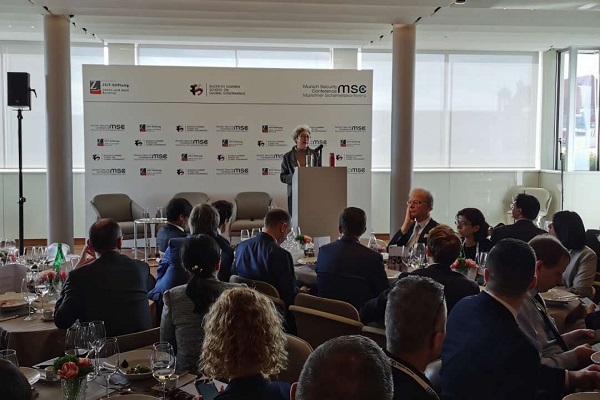 2020年2月15日,第56届慕尼黑安全会议举办以“在全球化中迷失:亚洲的世纪中欧洲的位置”为主题的午餐会。中国全国人大外事委员会副主任委员傅莹应邀出席并发表题为《世界需要合作共渡难关》主旨演讲。午餐会由图片报新闻记者阿里·阿斯兰(Ali Aslan)主持,德国联邦外交部国务部长尼尔斯·阿宁(Niels Annen)、印度观察家基金会副会长萨米尔·萨兰(Samir Saran)作为嘉宾参与讨论。