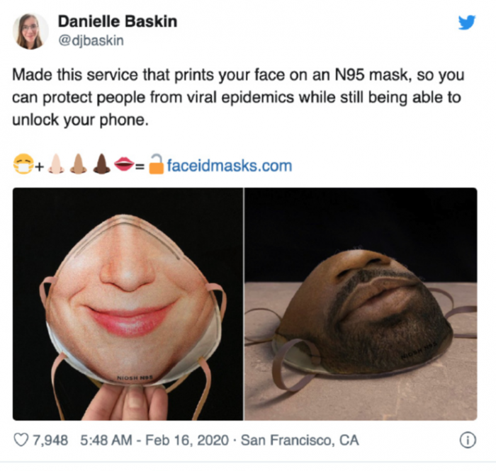 近日,产品设计师 Danielle Baskin 发布了一款带有面部信息的口罩,让人们带着口罩也能用 Face ID 解锁手机。