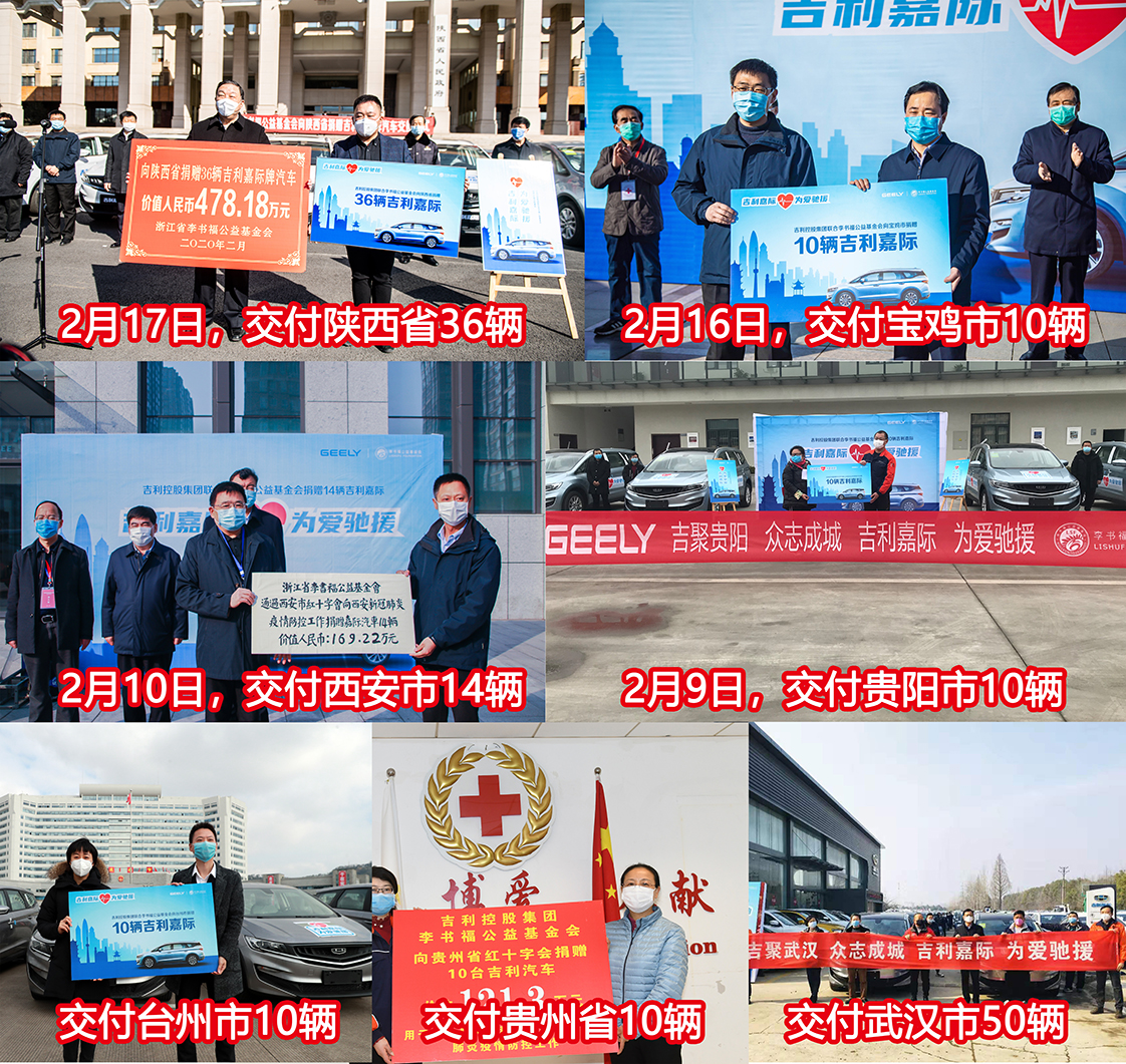 在新冠肺炎疫情爆发初期,吉利控股集团便第一时间携手李书福公益基金会,设立了2亿元人民币新型肺炎疫情防控专项基金,驰援疫情驰援各地疫情防控工作。截至目前,吉利已先后向武汉市、台州市、贵州省、贵阳市、西安市、宝鸡市、陕西省、晋中市、杭州市等省市累计捐赠了158辆嘉际,总价值超过2000万元,援助各地疫情防控工作。
