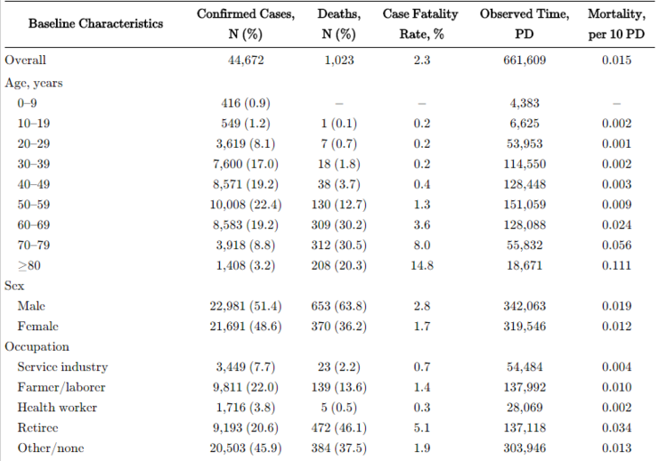 在该论文中,研究团队对于确诊病例,使用描述性统计病例的人口学和临床特诊,主要分析了患者特征、病死率、年龄分布和性别比例、疾病传播的时空特点以及所有病例、湖北省以外病例和医务人员病例的流行病学曲线。