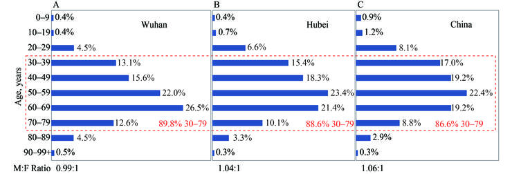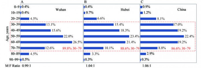 经分析,患者年龄主要集中在 30-69 岁之间(77.8%),轻度患者占 80.9%(下图分别展示了武汉、湖北和全国的确诊病例年龄分布特征)。