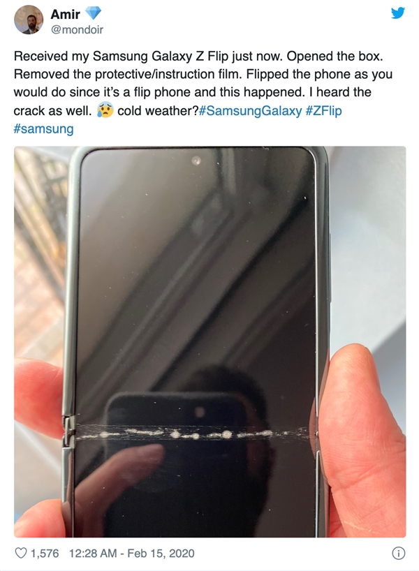 更令人担心的是,此次Galaxy Z Flip在发布之后,由于三星的迅速预定销售策略,导致两位首批购入 Galaxy Z Flip 的用户就遭遇了折叠屏损坏的问题。