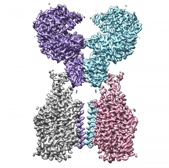 新型冠状病毒感染引发的肺炎疫情爆发后,武汉病毒研究所的科学家发现,新型冠状病毒和2003年的SARS病毒一样,也是通过识别ACE2蛋白进入人体细胞的,ACE2是“新冠病毒”侵入人体的关键。研究发现,在SARS病毒和“新冠病毒”侵入人体的过程中,ACE2就像是“门把手”,病毒抓住它,从而打开了进入细胞的大门。ACE2-B0AT1 复合物的冷冻电镜密度图