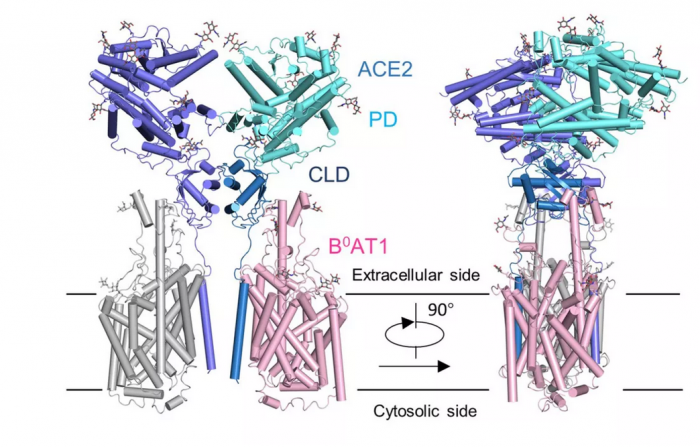比如,ACE2的二聚体与新冠病毒S蛋白的三聚体是否可以发生更高层级的交联,从而促进病毒与宿主细胞膜的融合或者内吞?之前有研究表明ACE2的胞外区如果被切割,将会更有效地促进冠状病毒的侵染,但是ACE2与B0AT1的复合物结构显示B0AT1的存在有可能阻碍蛋白酶靠近这个切割位点,这是否解释了病毒侵染症状主要发生在没有B0AT1的肺部?