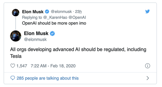 北京时间2月19日早间消息,特斯拉首席执行官埃隆·马斯克(Elon Musk)周一发文称,应该对所有人工智能都进行更好的监管,即便是对他的公司也不例外。他此举是是对《麻省理工科技评论》的一篇文章作出回应,后者称马斯克参与创办的OpenAI已经将其使命从安全、公平地开发和分发人工智能技术,转变为一家不断融资的秘密公司。