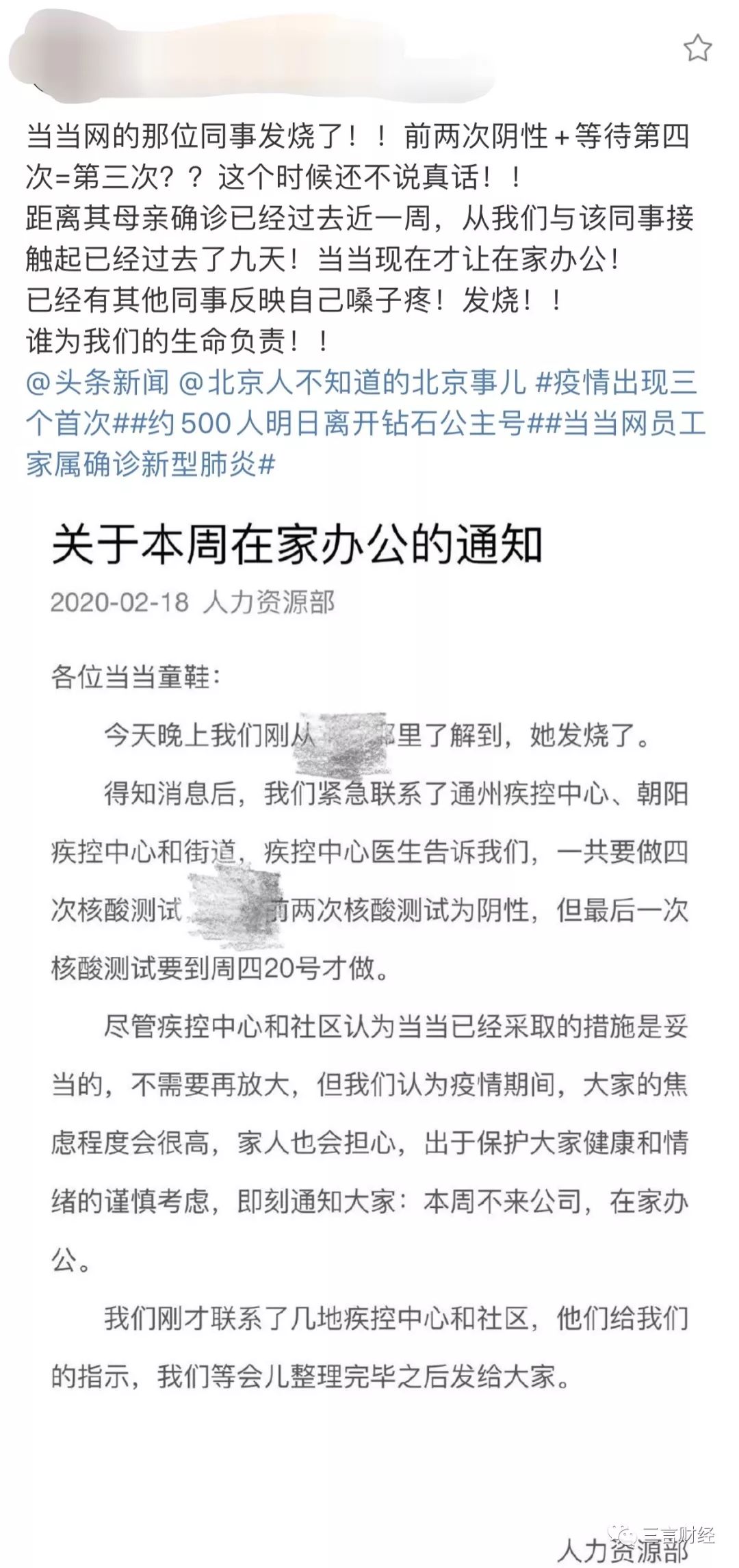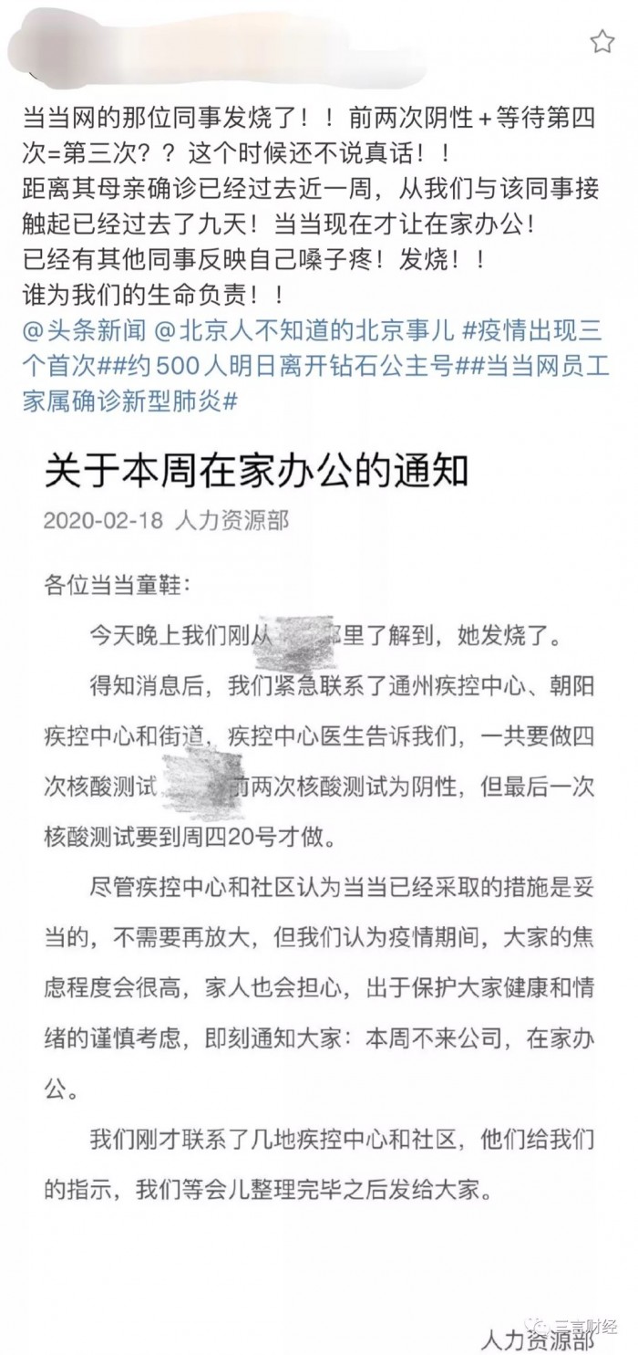 一个同事的妈妈被确诊,当当第一时间行动。这个同事几天后发烧,疾控中心表示还不是疑似,要等待检查,当当网安排全员回家