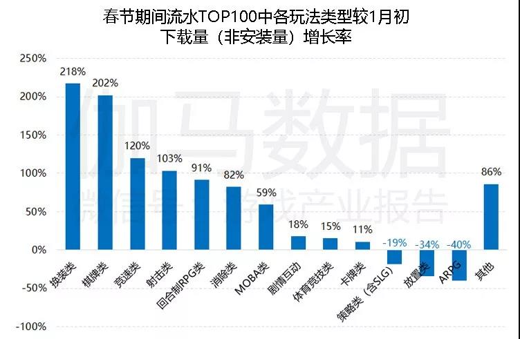 还有出乎人意料的是,春节期间流水TOP100产品当中,下载量增长率最高的并非棋牌类,而是换装类。