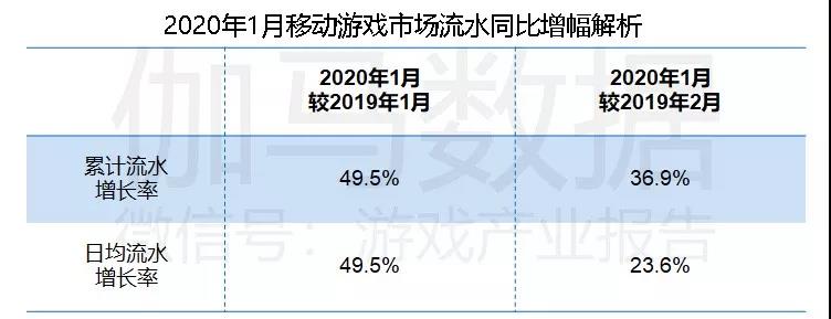 在统计iOS、安卓以及越狱市场分成前总流水后,伽马数据出具了2020年第一个月的手游报告《2020年一月移动游戏报告》(以下简称报告)。《报告》显示,2020年1月手游市场流水同比涨幅达49.5%,其中春节期间规模更达47.7亿元,与2019年春节相比增长35.9%。