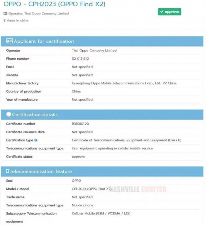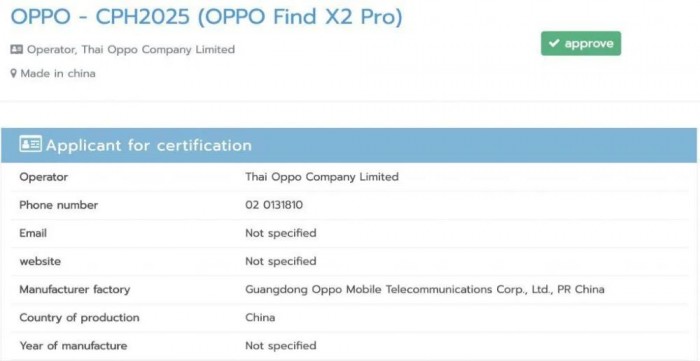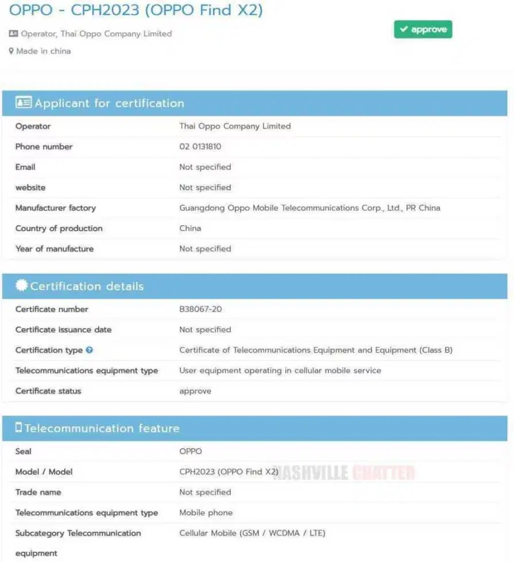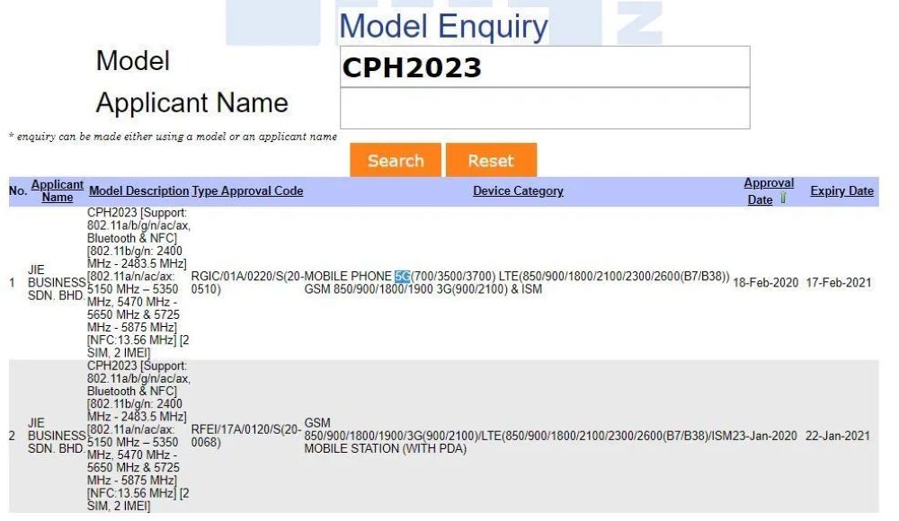 虽说在SIRIM官网上并未表示这款手机型号为 ”CPH2023“是OPPO旗下哪一款手机,但在泰国NBTC的认证网站上就显示这款手机对应的就是OPPO Find X2。而早前也有一款型号为 “CPH2025”的手机在2月1日通过了SIRIM认证,并且支持5G频段(700/3500);而在泰国NBTC的认证网站就显示了这款手机对应的是OPPO Find X2 Pro。