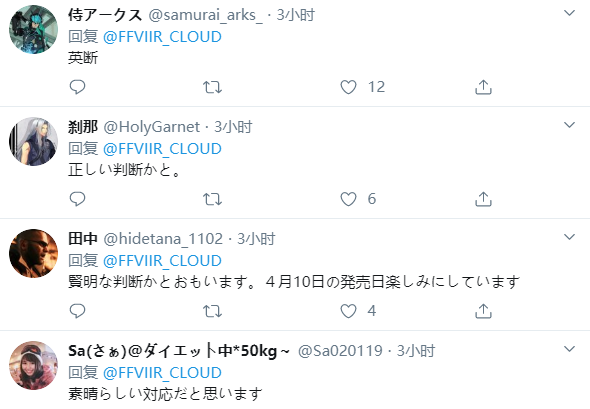对于此次活动的取消,日本网友的回复也是出奇的一致,称之为正确而英明的决断,并表示了对《最终幻想7:重制版》正式发售的期待。