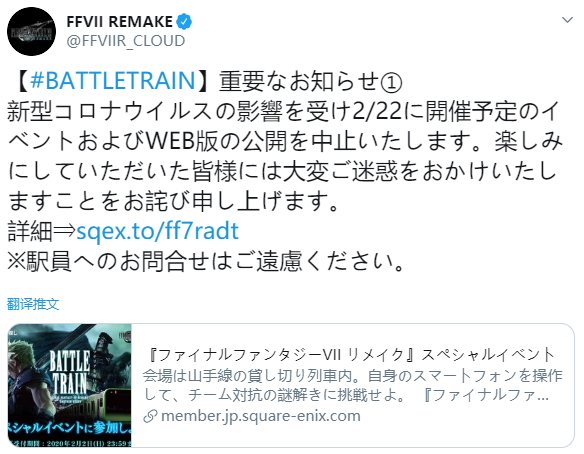 今日(2月19日),《最终幻想7:重制版》官方发布公告,宣布因新型肺炎疫情的影响,原定于2月22日正式举办的《FF7R》线下活动取消。