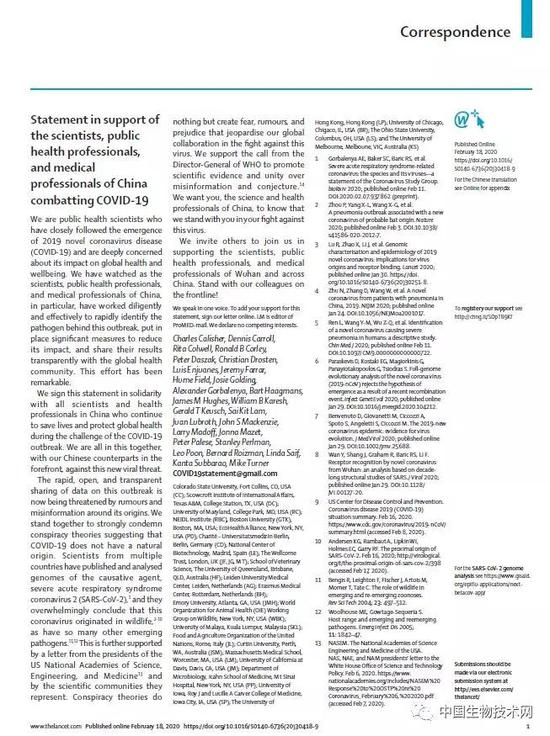 2020年2月18日,国际顶级医学期刊《LANCET》(柳叶刀)上发表通讯(Correspondence)文章,全球科学家发表声明反对阴谋论,全力支持奋战在疫情一线的中国科研技术工作者。