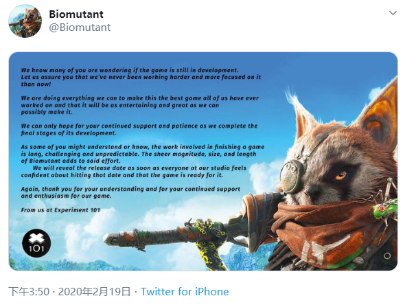 开发商Experiment 101公告原文翻译: