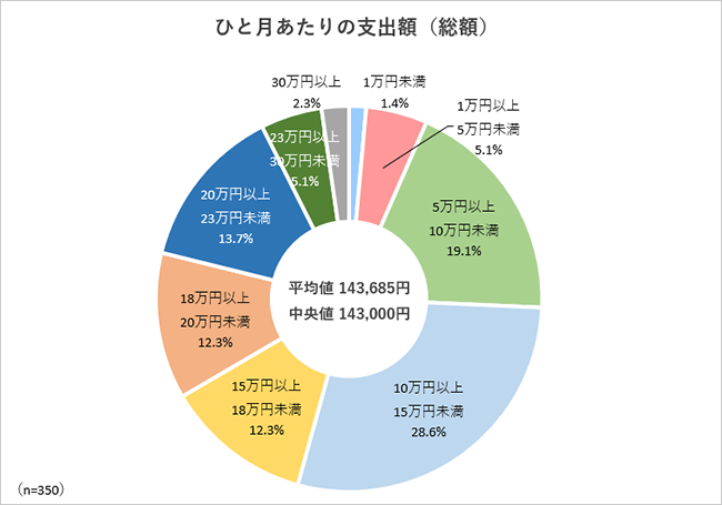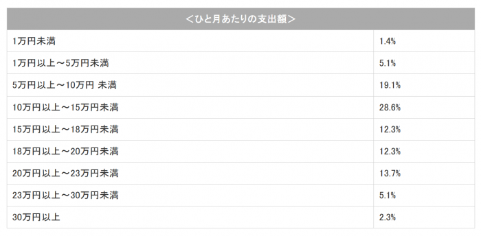 受访女性平均月支出143685日元,28.6%表示每月在账单和必需品上支出在10万-15万日元之间。其中包含了租金、水电费、交通费、兴趣爱好、美容护理等杂项开支,但不包括娱乐和外出就餐等。