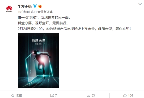 华为手机官微称,“借一双“慧眼”,发现世界的另一面。智慧分屏,视野全开,无畏前行。2月24日晚21:00,华为终端产品与战略线上发布会,前所未见,等你来见!”