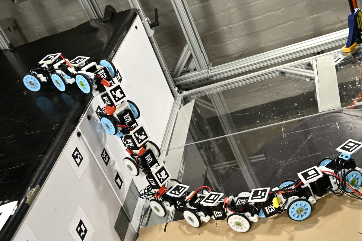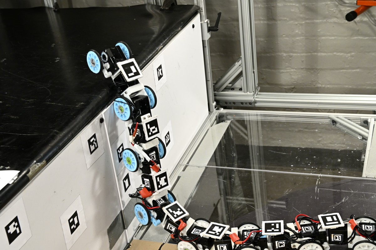 在查看了蛇的视频之后,研究生傅启元(音译)开始着手建造蛇形机器人。十段轮式履带车的早期版本在遇到台阶时经常遇到稳定性问题,经常翻倒或卡住。工程师通过在每个单向轮与车身各部分之间插入一个悬架机构来降低其侧倾不稳定性。如今,这种蛇形机器人能够在攀爬时将自己推向地面,几乎可以爬上“高度是其身体长度38%的”台阶。