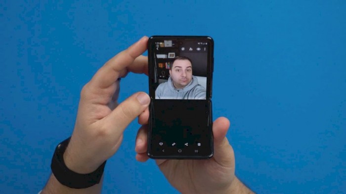 手机外部的主摄像头一个采用三星1200万像素传感器,f/1.8光圈,另一个是1200万像素超广角,但传感器更小,f/1.8光圈。打开后手机内部还有个镜头,1000万像素,f/2.4光圈,比去年的Galaxy S10系列还落后了一点,但这款手机可以折叠不同的角度,平放在桌子上,进行视频通话或自拍。很有创意的玩法。