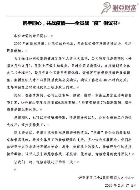 2月17日,网传一份诺亚财富向全体员工下发的全员战“疫”倡议书。