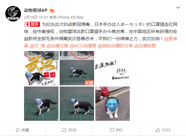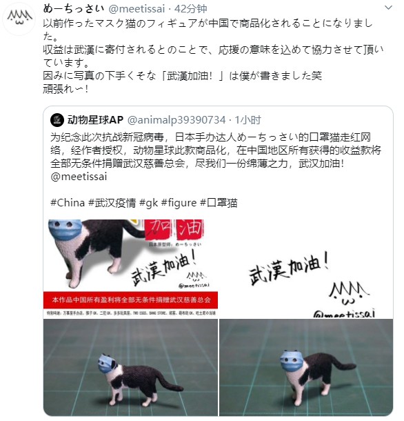 为纪念抗战新冠病毒,日本手办达人めーちっさい推出了口罩猫手办,成品效果不错,现在这款手办已经走红网络。模型工作室动物星球AP已获得口罩猫手办的授权,推出了口罩猫手办的商品。这款手办现在发售中,售价80元人民币,在中国地区所有获得的收益款将全部无条件捐赠武汉慈善总会,尽一份绵薄之力,为武汉加油。