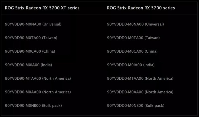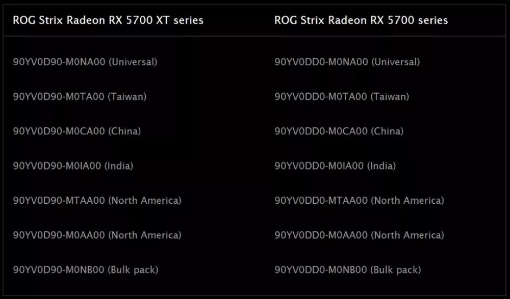 ROG Strix Radeon RX 5700 XT系列:90YV0D90-M0CA00(国行)、90YV0D90-M0NA00(通路)、90YV0D90-M0TA00(台版)、90YV0D90-MTAA00(美版1)、90YV0D90-M0AA00(美版2)、90YV0D90-M0IA00(印度版)、90YV0D90-M0NB00(散装)。