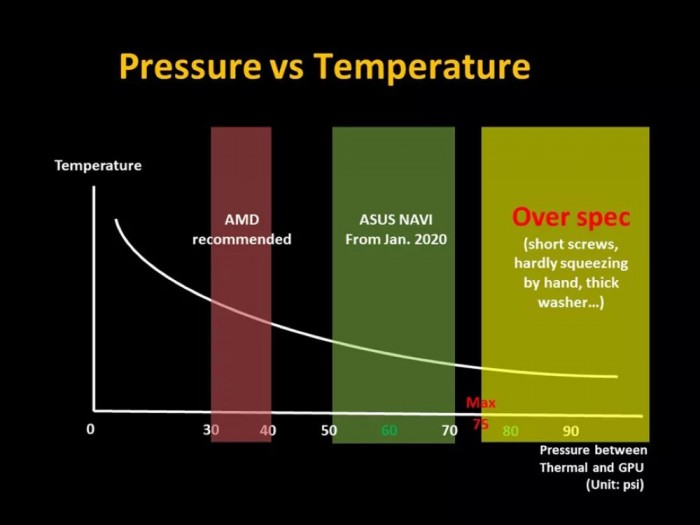 华硕表示,虽然AMD告诉制造商要使用30-40 PSI的力来安装散热器,但它发现可以将安装压力提高到50-60 PSI之间,从而使显卡能够保持较低的温度。