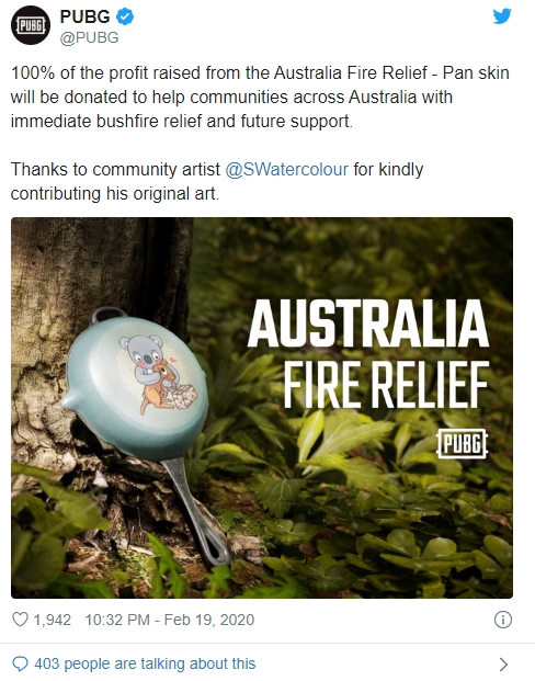 今天,《绝地求生》官方Twitter宣布,推出一款“考拉袋鼠平底锅”特定款皮肤。活动结束后,所有筹得的善款都将捐赠给澳洲一家动物保护机构。