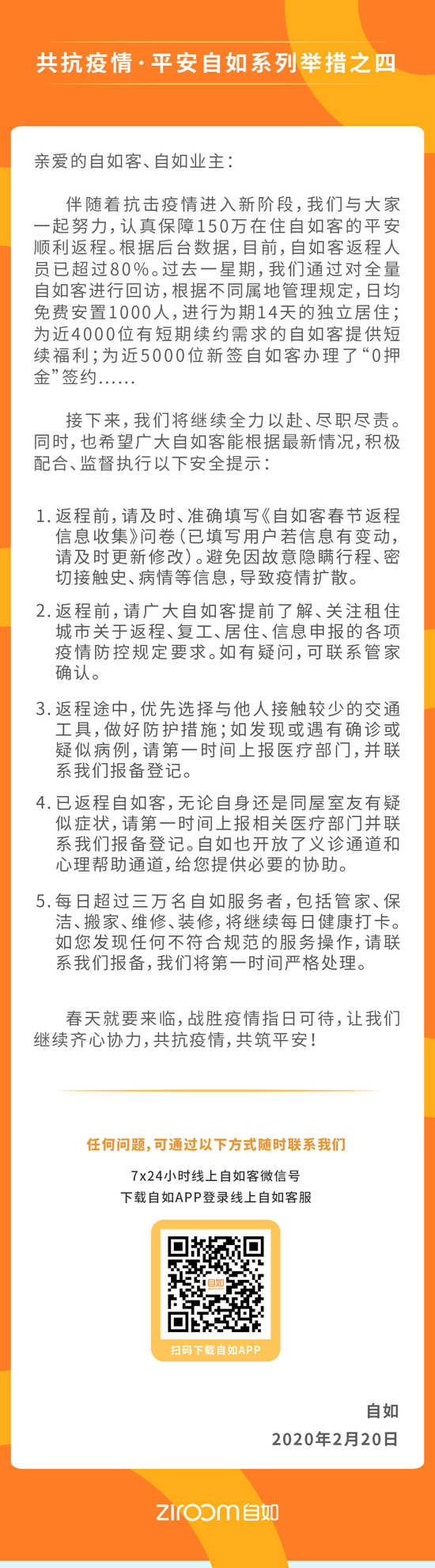 另外,为更好地安置各个城市的返程租客,此前自如已通过在线问卷、建立租客风险等级、追踪回访等举措,对租客进行妥善安置。新公告内容显示,目前自如租客返程人员已超过80%。过去一周,自如对全量租客进行了回访,日均安置1000名租客,为其安排14天隔离期所需的临时独立住所。