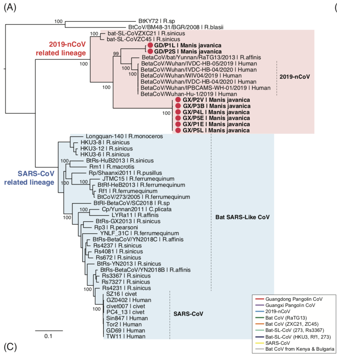 在此次这项最新研究中,管轶等人报告了在中国南部反走私行动中查获的穿山甲(哺乳纲鳞甲目)中发现了2019-nCoV相关冠状病毒。他们发现,穿山甲相关的冠状病毒属于2019-nCoV相关冠状病毒的两个亚型,其中一个的受体结合域与2019-nCoV非常接近。