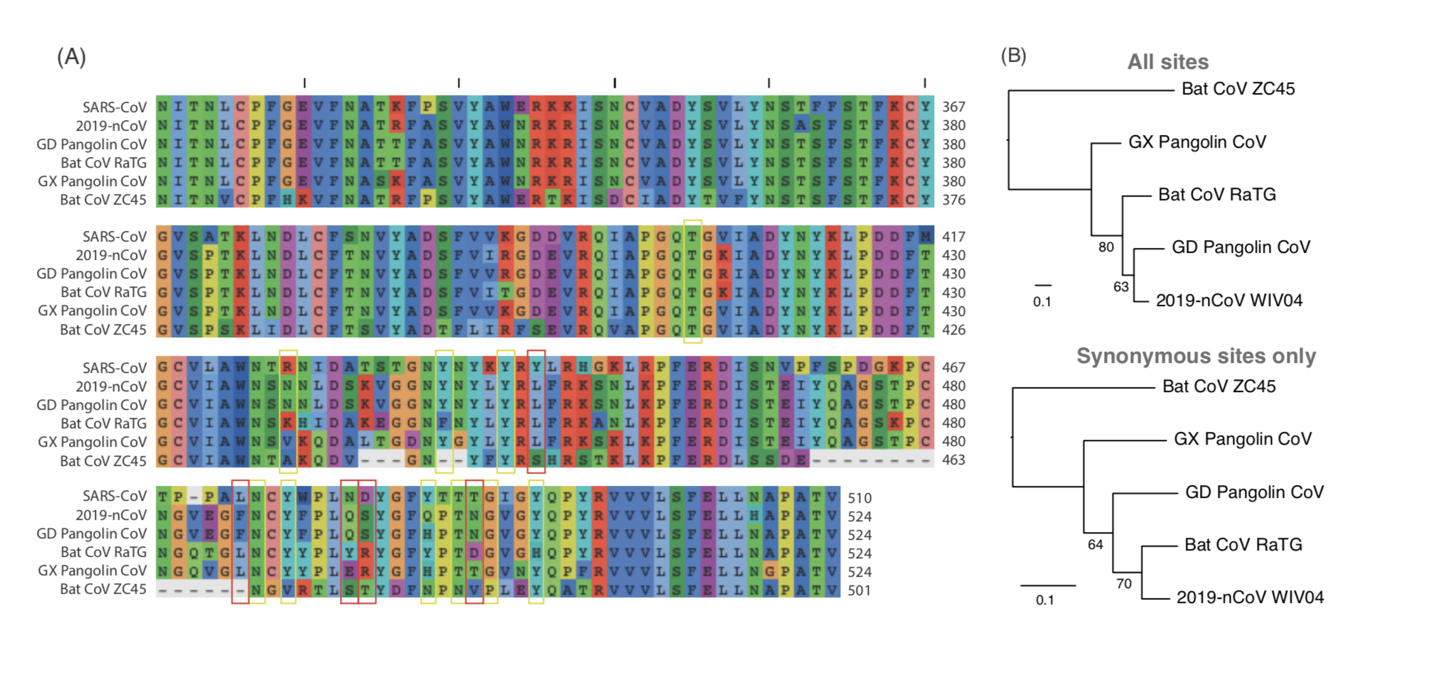 事实上,广东穿山甲冠状病毒和2019-nCoV在RBD的5个关键残基上拥有相同的氨基酸,而RaTG13和2019-nCoV只有一个氨基酸相同。然而,只针对RBD的同义位点系统发育分析显示,广东穿山甲冠状病毒并非2019-nCoV的最接近亲缘关系。