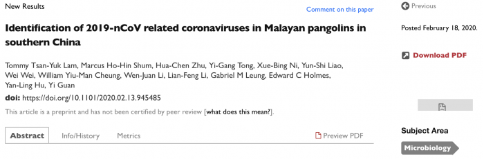 新冠病毒的溯源研究得出最新成果。当地时间2月18日,预印本网站bioRxiv(未经同行评议)发表论文“中国南方马来穿山甲2019-nCoV相关冠状病毒的鉴定”,通讯作者为香港大学公共卫生学院新发传染病国家重点实验室管轶教授、广西医科大学胡艳玲教授。