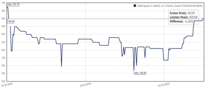 然而锐龙5 3400G最近还开始涨价了,德国市场上1月底到现在的价格涨了20%左右,现在全面回到了160欧元以上。