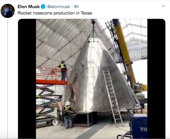 2月20日,美国太空探索技术公司SpaceX首席执行官埃隆·马斯克(Elon Musk)发推文再一次更新了该公司迅速扩张的德克萨斯州星际飞船装配工厂取得的最新进展。视频中展示了大量处于不同建造阶段的火箭鼻锥。网友认为该鼻锥就是为即将到来的星际飞船所生产的。