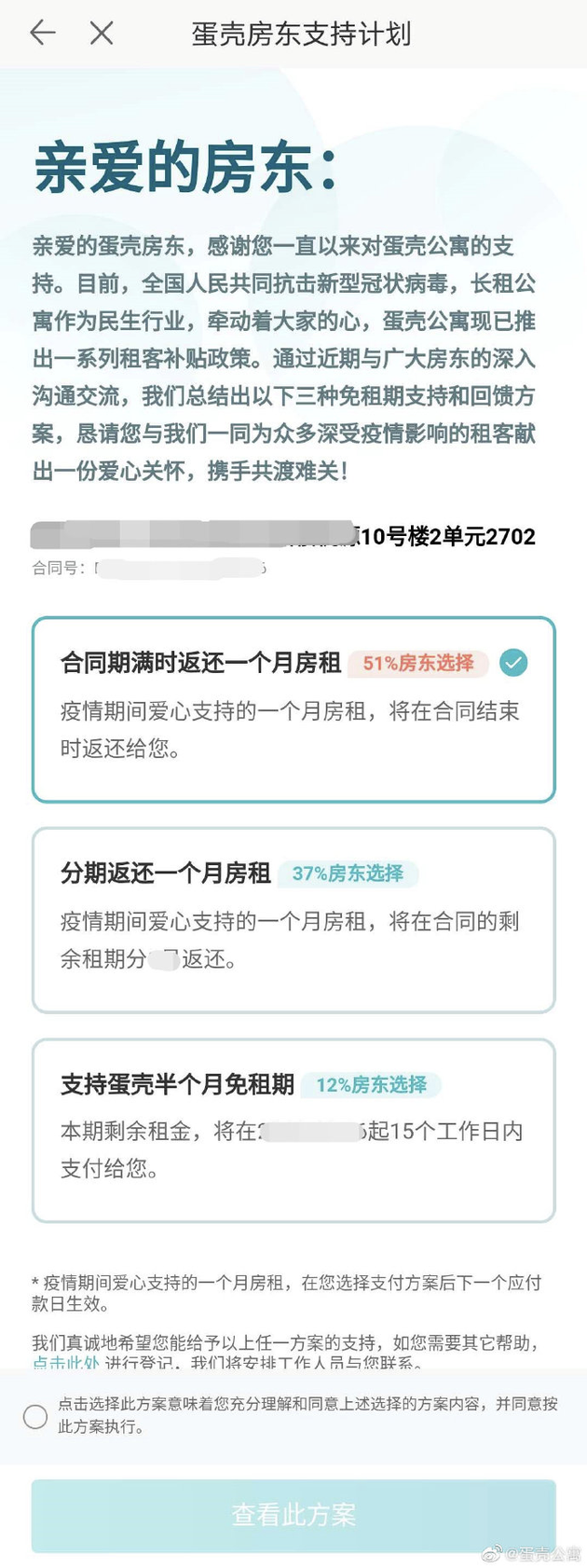 蛋壳公寓今日在官微上公布针对房东的免租解决方案,一共三种方案可供选择,其中房东如若同意免租一个月,蛋壳可在合同期满时给与返还、或分期返还。此前,蛋壳公寓被质疑强制要求房东免租1个月,武汉房东甚至长达3个月。
