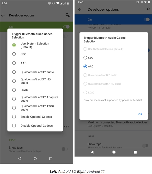 今晨,Android 11首个开发者预览版推送,不少新特性登陆。一番体验后,外媒发现,Android 11的开发者选项中对蓝牙音频解码格式选项框进行了优化,可以识别出蓝牙音频设备实际支持的解码类型。