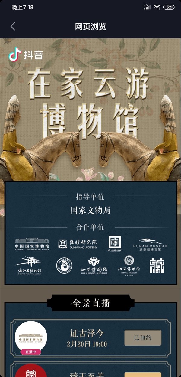 据悉此次活动由国家文物局指导,首批参与合作的有国内九大一级博物馆,包括中国国家博物馆、敦煌研究院、南京博物院、湖南省博物馆、浙江省博物馆、辽宁省博物馆、山东博物馆、山西博物院、广东省博物馆。这些博物馆珍藏的音视频、VR实景将接入抖音平台,供广大网友在线浏览。