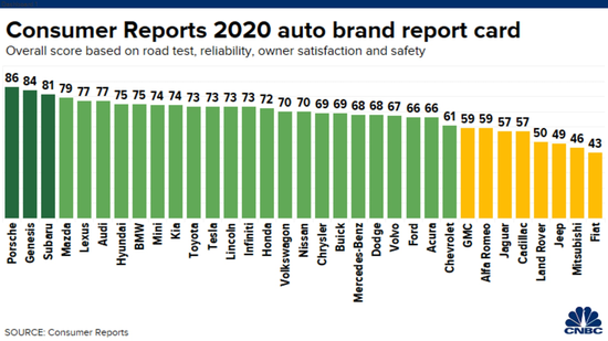 今年,该公司将保时捷评选为最佳汽车品牌,紧随其后的是捷恩斯和斯巴鲁。相比之下,《消费者报告》将菲亚特列为最差品牌,紧随三菱和吉普之后。