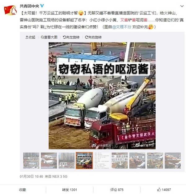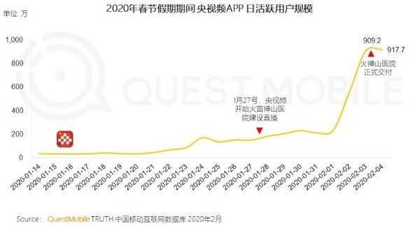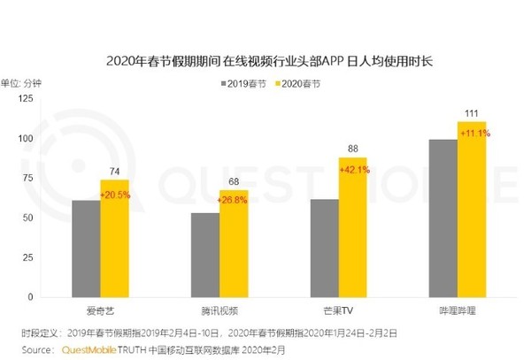 除了短视频,在线视频的使用时长也有了可观的增长。比如哔哩哔哩的日人均使用时长较2019年春节增长11.1%,爱奇艺增长了20.5%,腾讯视频增长了26.8%,而芒果TV更是增长了42.1%。值得注意的是,央视频在“疫情24小时”专题中直播了火神山、雷神山医院的建设情况,得到了用户的极大关注,而且也带出了“云监工”“给建设设备起外号”等一系列趣事,比如给水泥车、叉车起名“呕泥酱”“叉酱”等。