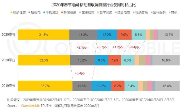 除了游戏,视频也出现了明显的增长。相比于去年春节,短视频使用时长占比长超过了手游,占比达17.3%,同期手游占比为12.2%。这与大家通过短视频娱乐、了解疫情及防范情况,学习健康卫生知识等有着很大的关系。