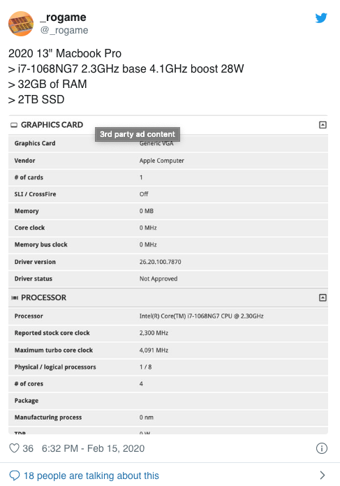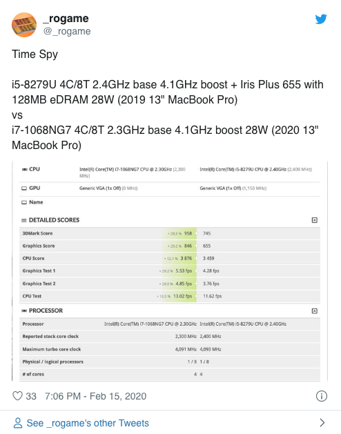 现在苹果13英寸MacBook Pro也即将迎来更新,在推特上面甚至有了新13英寸MacBook Pro的跑分,根据@_rogame 公布的最新3DMark基准测试结果。
