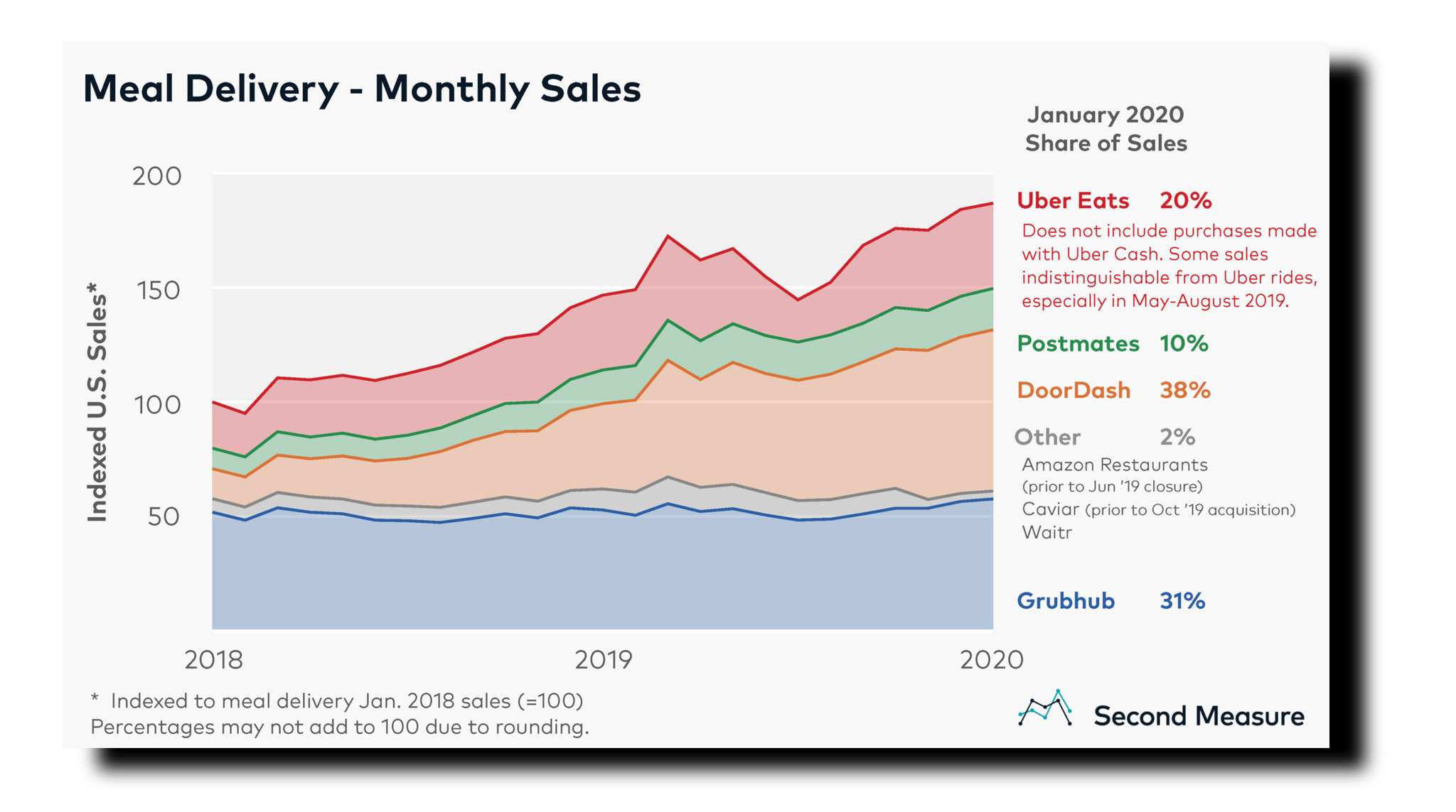 Second Measure通过其子公司Seamless和Eat24将Grubhub归为一个类别。Grubhub是一家上市公司。DoorDash的2020年上市计划目前尚未公开。Uber是一家上市公司。这与较大的“市场”类别略有不同,但它仍然使我们对在该领域快速成长的公司应注意的事项有所了解。