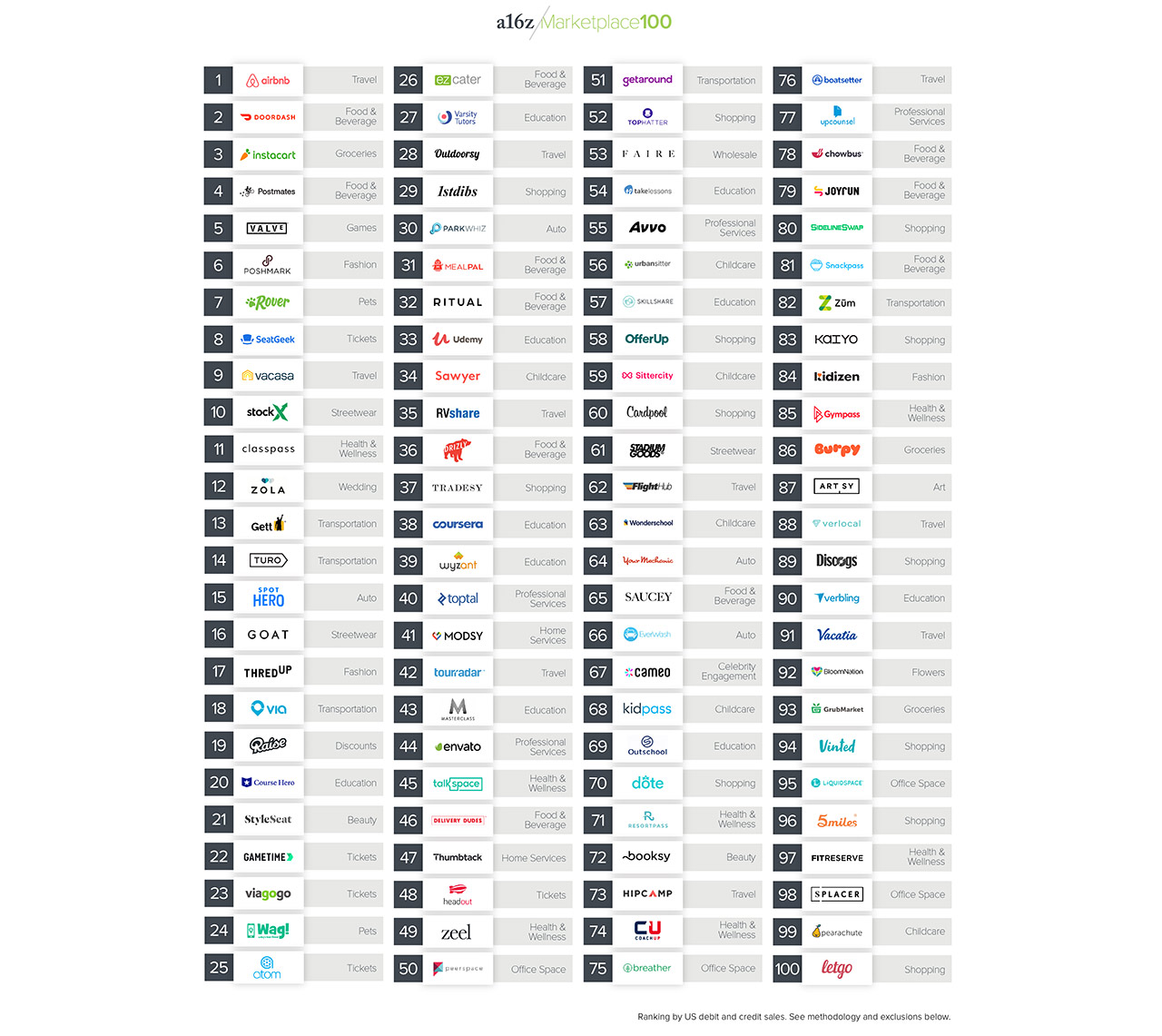 该机构根据商品总价值(GMV)对榜单中排名最高的私营或创业公司进行排序。GMV的A16Z定义是“根据消费者在每个公司上花费的总金额得出的。” 该数据是根据2018年12月至2019年11月的期间的数据计算的。此列表不包括过去12个月内开始处理付款的企业。