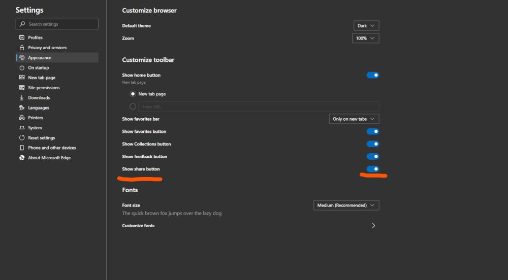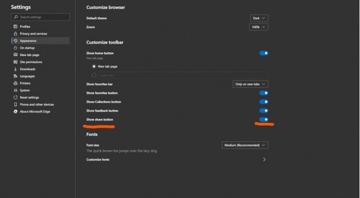 在Edge Insider支持页面的HotCakeX率先注意到了这项改变。如果当前你使用的是Edge Canary版本,那么通过转到“设置”>“外观”>“自定义工具栏”,将分享按钮添加到工具栏上。