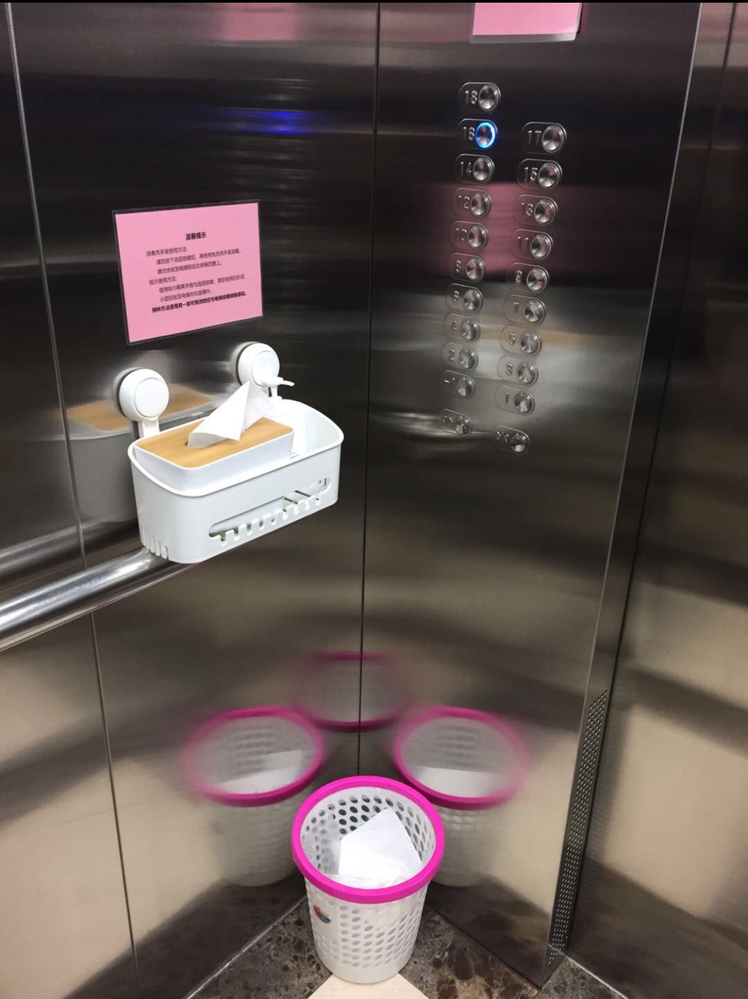 据Lisa观察,她所在的办公区的所有的公共区域都标上了“已消毒”,电梯里也挂上了免洗洗手液和纸巾。